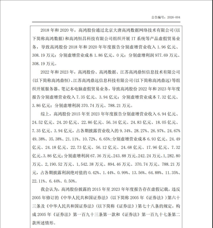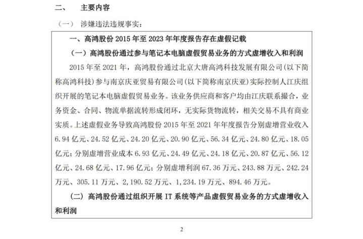 2015年至2021年间,大唐高鸿通过子公司高鸿科技参与南京庆亚贸易有限公司(简称南京庆亚)实际控制人江庆组织开展的笔记本电脑虚假贸易业务,该业务供应商和客户均由江庆联系撮合,业务资金、合同、物流单据流转形成闭环,无实际货物流转,相关交易不具有商业实质。该业务导致大唐高鸿在7年间,虚增收入超185亿元,由于是虚假贸易业务,虚增利润金额约5178万(虚假贸易的特点,赚量不赚钱)。