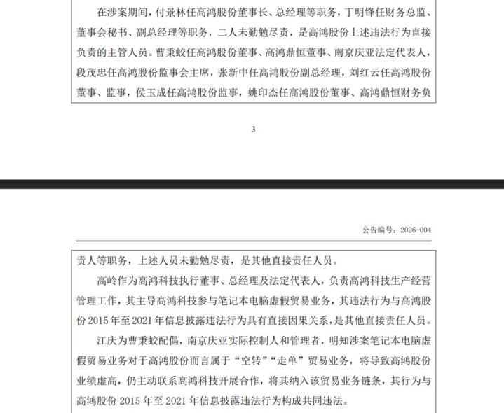 特别是,时任任高鸿股份董事曹秉蛟在知悉高鸿科技关笔记本电脑贸易业务无商业实质,作未对相关收入确认提出异议,并且还接受高鸿鼎恒总经理江庆委托,管理虚假贸易业务,审批资金付款申请。