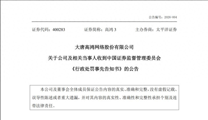 小供注意到,近日,大唐高鸿网络股份有限公司(简称大唐高鸿)收到证监会出具的《行政处罚事先告知书》。